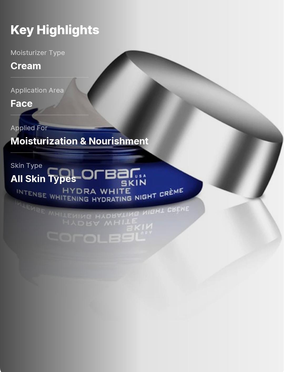 COLORBAR Hydra White Intense Whitening Hydrating Night Cream is a rich overnight treatment designed to deeply moisturize and revive tired skin while you sleep.