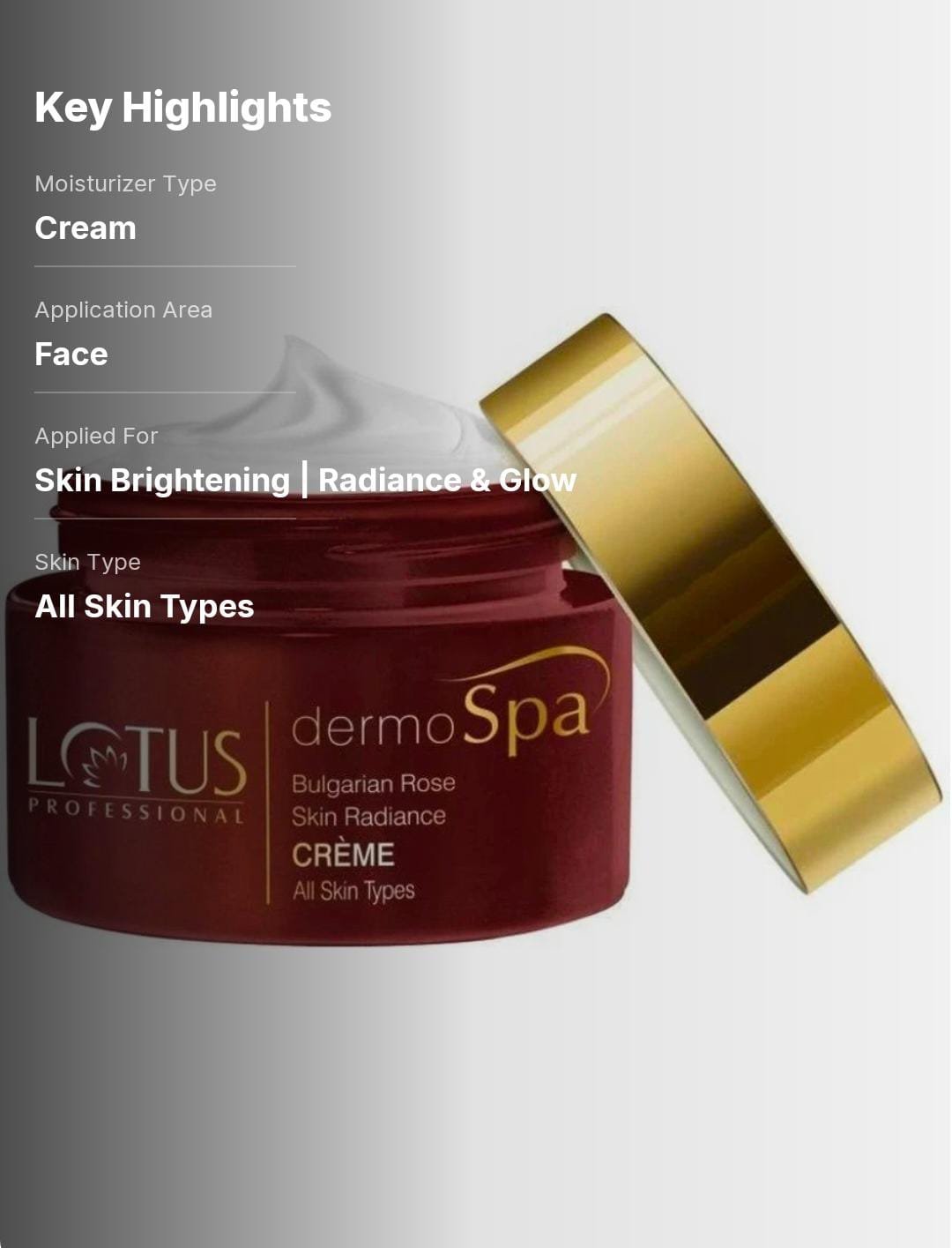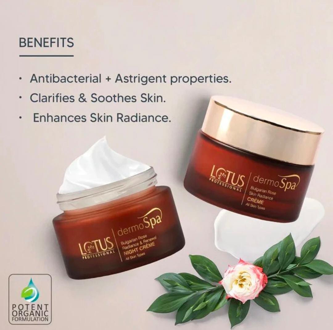 Lotus Professional Dermo Spa Bulgarian Rose Skin Radiance Day Cream is a luxurious daily moisturizer enriched with Bulgarian rose extracts to hydrate and brighten the skin. It helps improve radiance, smooth texture, and restore a healthy glow while keeping skin soft and refreshed throughout the day it suitable for all skin types.